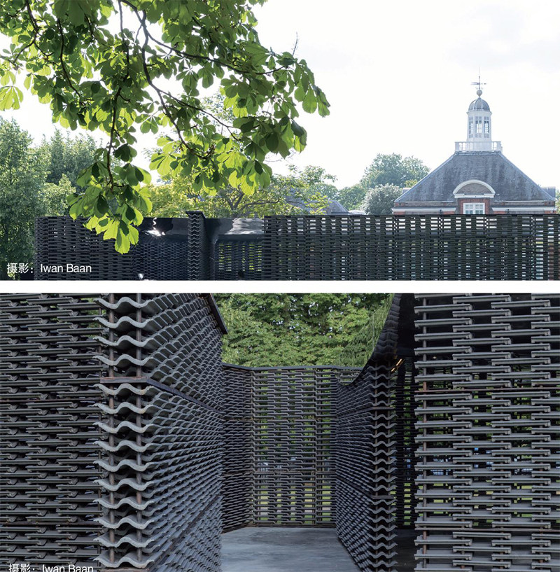 我們都知道,水泥瓦一般用作普通民房或者高檔別墅的屋頂建設,但是設計師弗里達、埃斯科韋多設計的蛇形展亭,以水泥瓦建造,這種水泥瓦一般用于建造屋頂,顏色偏深而且具有獨特的質(zhì)感。展亭將水泥瓦以左右錯位、類似植物的排列方式堆疊,形成帶有墨西哥特色的鏤空墻幕。展亭的庭院中還設一個三角形的水池,屋頂?shù)紫聞t以鏡面鋪就,在日光照射下將呈現(xiàn)不同的視覺效果。展亭的中軸線從南延伸至北,與數(shù)英里以外的格林威治子午線的方向契合,以此強調(diào)展亭同時也是“時間儀”的這一特質(zhì)。